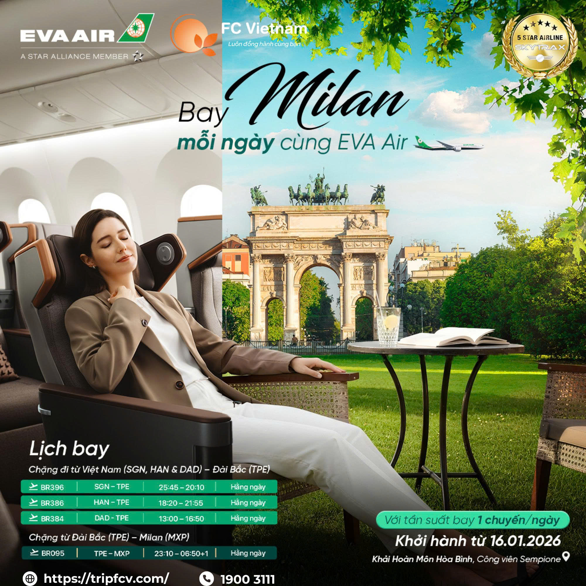Tin vui cho các tín đồ du lịch và thời trang! Từ 16/01/2026, EVA Air sẽ chính thức bay hằng ngày tới “Kinh đô thời trang thế giới” – Milan, Italia.