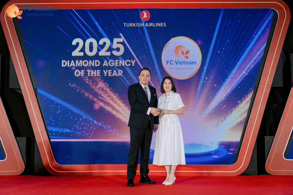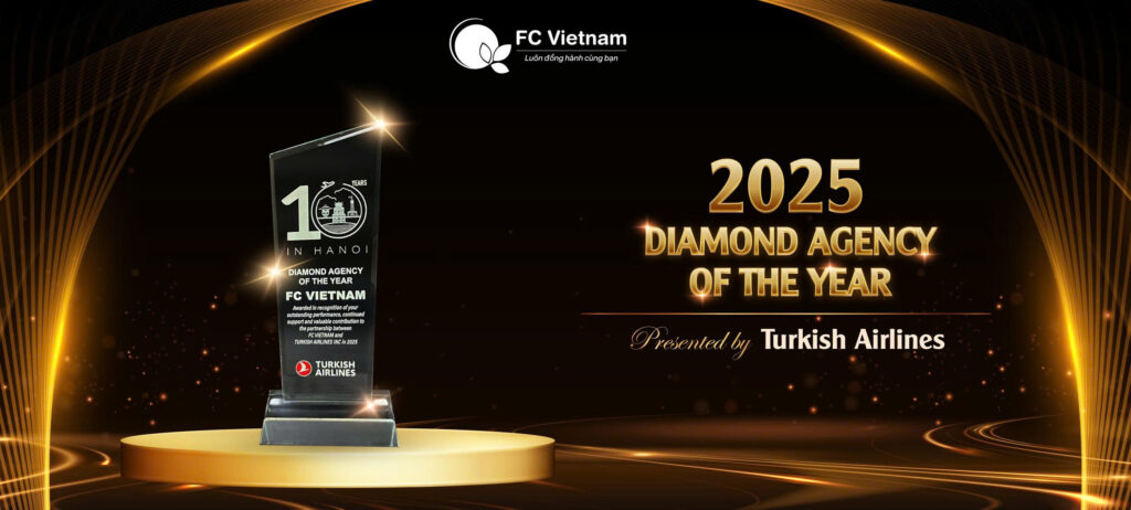 Trong không khí trang trọng của buổi lễ, F.C Việt Nam vô cùng tự hào khi được xướng tên cho danh hiệu cao quý nhất: DIAMOND AGENCY OF THE YEAR. Giải thưởng là sự ghi nhận cho những nỗ lực bứt phá và sự đóng góp bền bỉ của tập thể đội ngũ F.C Việt Nam trong trong suốt hành trình hợp tác cùng Turkish Airlines.